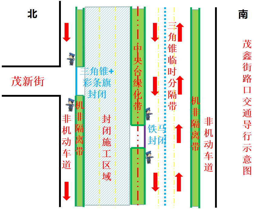 利用鐵馬對(duì)北側(cè)機(jī)動(dòng)車道小緯北路、交警大隊(duì)及茂新街路口中央過(guò)路口進(jìn)行全封閉,行人及車輛臨時(shí)可通過(guò)緯二路及北坦南街路口進(jìn)行通行。