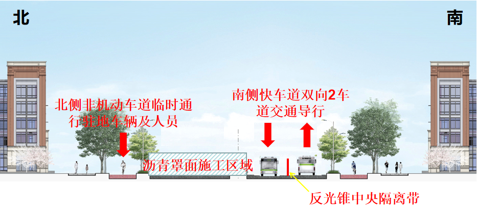 為便于社會(huì)車輛通行,在北坦南街路口向東方向拆除30m中央隔離帶,提前引導(dǎo)社會(huì)車輛導(dǎo)行至南側(cè)快車道。