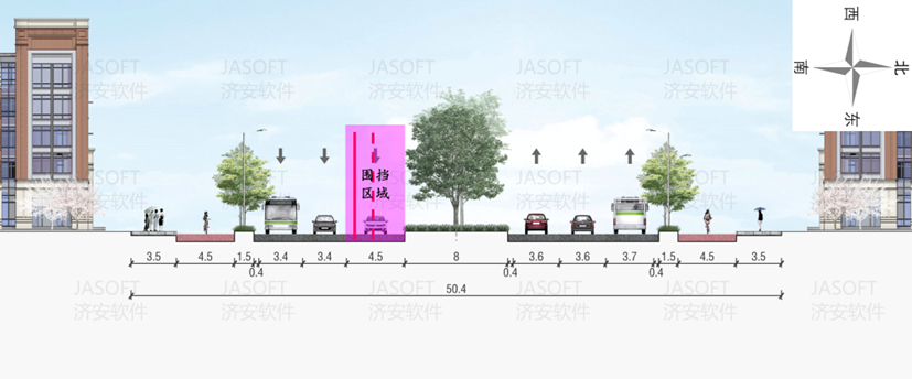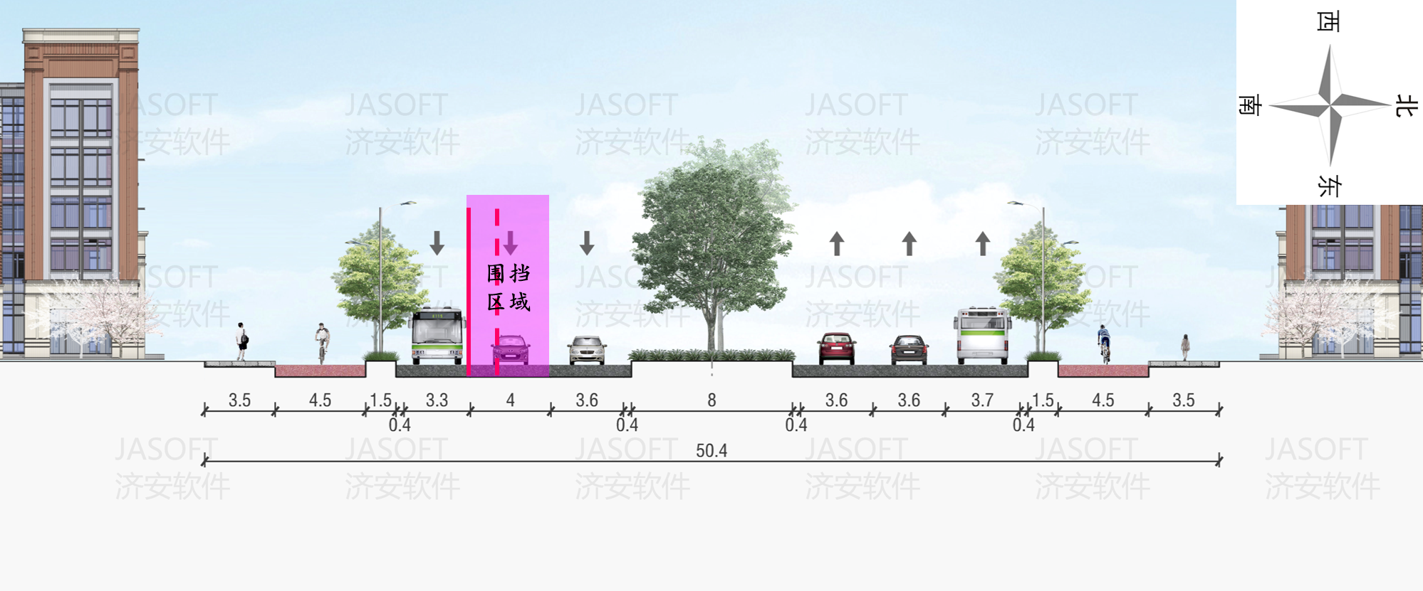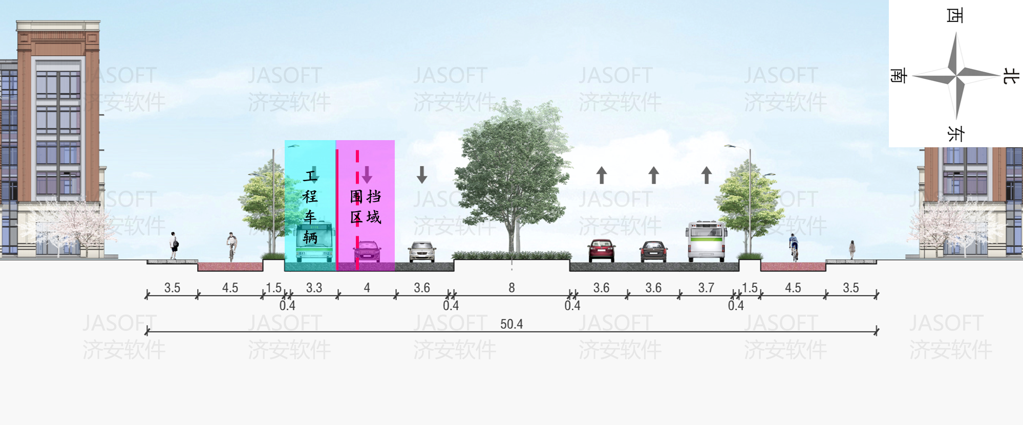 施工期間,劉長山路(順通石化加油站-魏華西路)封閉南半幅最內側4.5m寬機動車道,南半幅進行橫斷面重塑,圍擋南側機動車道寬度均設置為3.4m,施工期間公交車道全天允許社會車輛通行,西向東剩余2條機動車道通行,東向西機動車及慢行通行條件不變。夜間臨時占用圍擋外側路段50m供工程車輛臨時停靠。